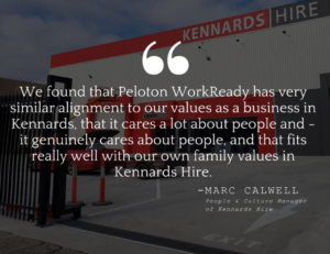 “I’m Marc Calwell, People & Culture Manager of Kennards Hire. Kennards is the largest family-owned equipment rental company in Australia and New Zealand. We found that Peloton WorkReady has very similar alignment to our values as a business in Kennards, that it cares a lot about people and – it genuinely cares about people, and that fits really well with our own family values in Kennards Hire.” – Marc Calwell, People & Culture Manager of Kennards Hire
